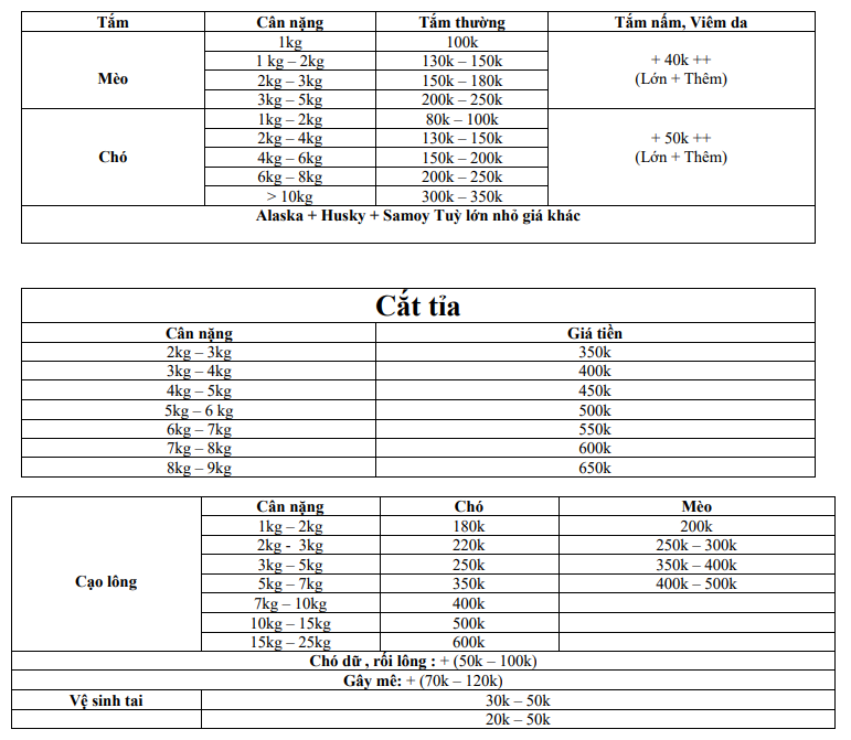 Bảng giá các dịch vụ làm đẹp hiện đang áp dụng tại Thú Cưng Hương Nở: