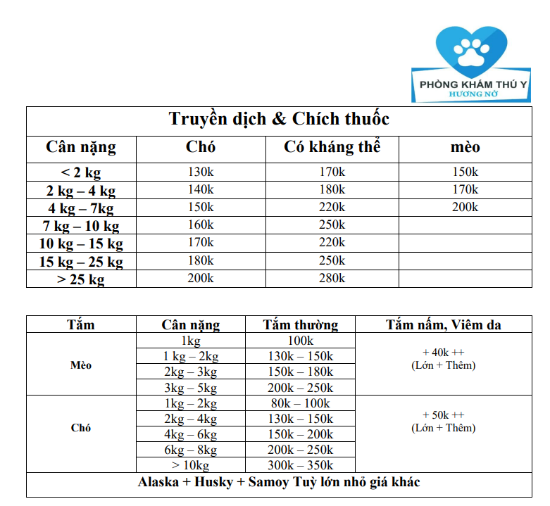 Bảng giá dịch vụ điều trị bệnh hiện đang áp dụng tại Bệnh viện Thú Y Hương Nở Bình Dương: