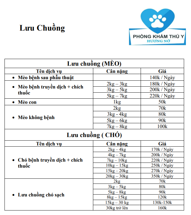 Bảng giá dịch vụ điều trị nội trú – lưu trú chó mèo hiện đang áp dụng tại Thú Cưng Hương Nở: